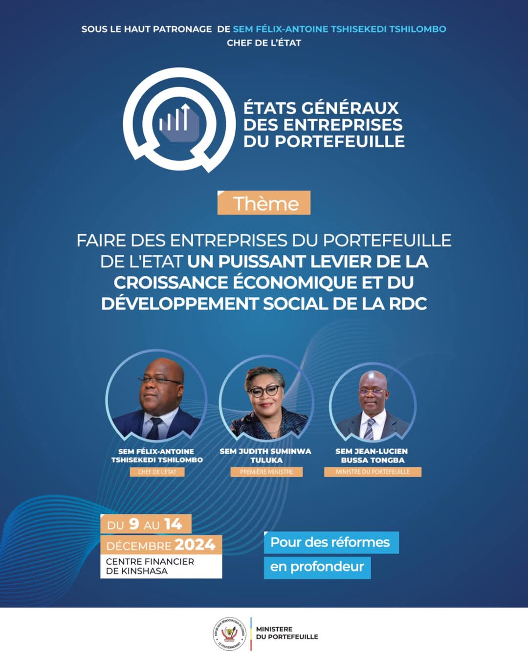 Sous le Haut Patronage du Président de la République Félix Antoine Tshisekedi chef de l’état, sous les auspices de la Première Ministre cheffe du Gouvernement SEM Suminwa Judith, le Ministre du Portefeuille SEM Jean Lucien BUSSA à organisé les états généraux du Portefeuille avec pour thème principal,